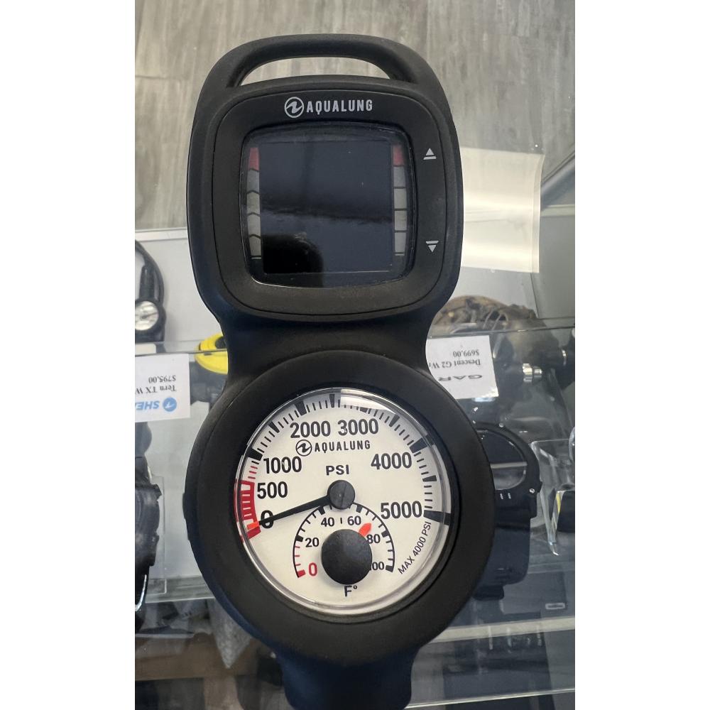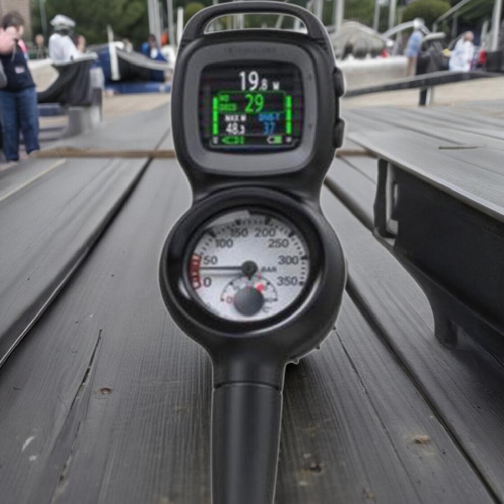 The Aqualung i330R Computer is housed in a console boot with a submersible pressure gauge. Designed with ease of use and simplicity in mind, the pressure gauge display has a luminescent gauge face for easy reading in low light. The Aqualung Pressure Gauge delivers both remaining air pressure and temperature in one easy-to-read display. Easy-to-read scale up to 5,000 psi rated. Integrated temperature scale, Nitrox compatible up to 50%, Swiss-made, shock-resistant Bourdon tube, one-way safety valve and a hose length of 36" (91.44cm) with 7/16" threads.