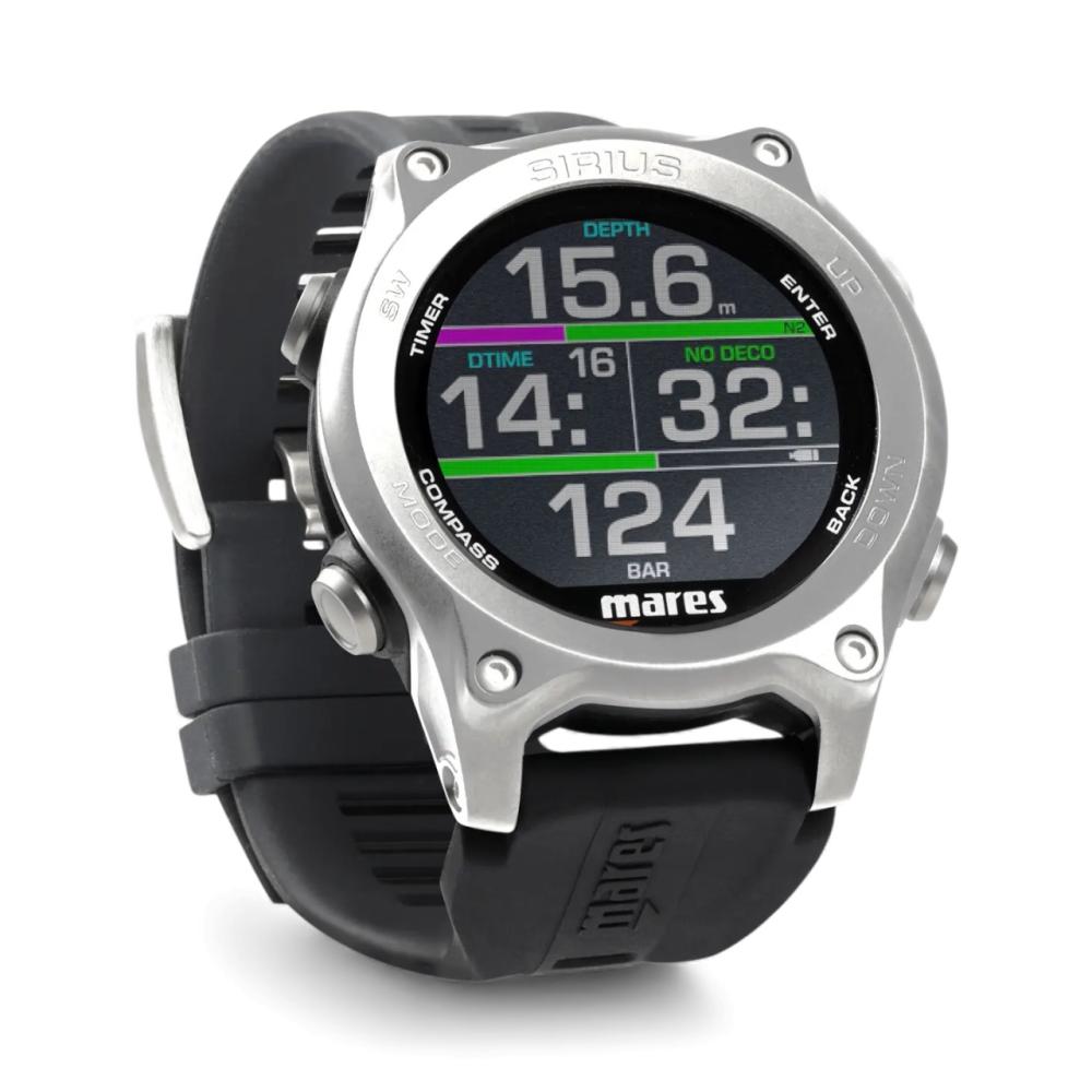 Mares designed the new Sirius watch-style dive computer with the aim of perfectly combining technology and elegance. The characteristics of this dive computer feature top-of-the-range technology both for recreational and Extended Range divers. The recreational diver will see a simple screen, with the possibility of reading tank data thanks to the optional tank module. The Extended Range diver can insert up to five nitrox and trimix mixes to manage technical dives. The interchangeable strap allows the Extended Range diver to use any suit thickness. Its refined style makes the Sirius the perfect accessory, even out of the water. Available in black or black/silver versions.