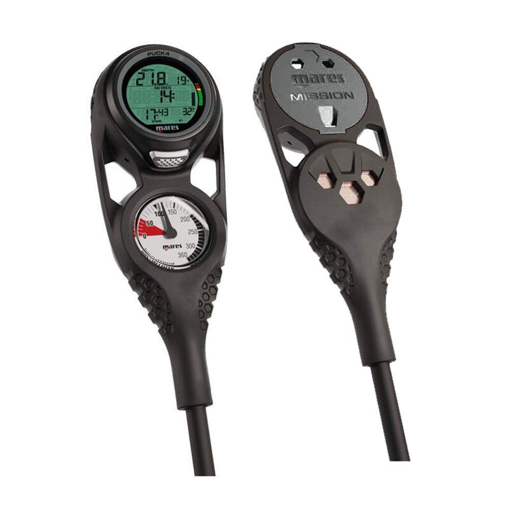 Dive Smarter with the Mares Puck 4 Mission 2 Dive Console. Elevate your underwater expeditions with this Console, engineered for divers of all levels. This state-of-the-art scuba diving console incorporates the sophisticated Buhlmann ZH-L16C algorithm, offering customizable safety measures for your dives. Its long-lasting battery supports up to 100 dives, ensuring dependability dive after dive. Connect effortlessly to your smart devices via integrated Bluetooth for straightforward data management and benefit from continuous firmware enhancements through the Mares app. Unmatched Precision and Resilience Underwater. Crafted for durability, the Mission 2 Console boasts a sturdy brass case and a crystal-clear technopolymer window, with a phosphorescent dial that simplifies tank pressure readings in dim conditions. The console's thermoplastic elastomer construction provides exceptional protection, while two sizable eyelets and an ergonomically designed grip area enhance its usability and comfort during your dives. This console blends high functionality with aesthetic appeal, making every dive more enjoyable and efficient.