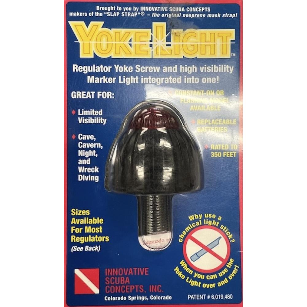 Long lasting Super Bright Yoke Light integrates the marker light with the regulator yoke screw. Simply replace the existing yoke screw with the Yoke Light. Made of durable plastic so the Yoke Light can be permanently installed. Available in both Constant-On and Flashing models. Lasts 12 hours (constant-on model) and 30 hours (flashing model) between battery changes. Models available to fit most regulators (see price list). Battery included